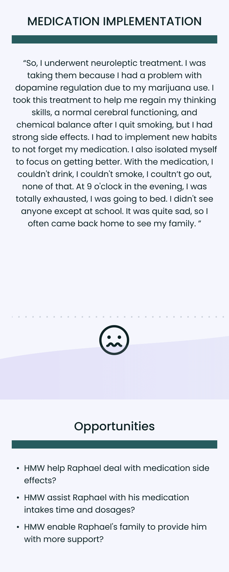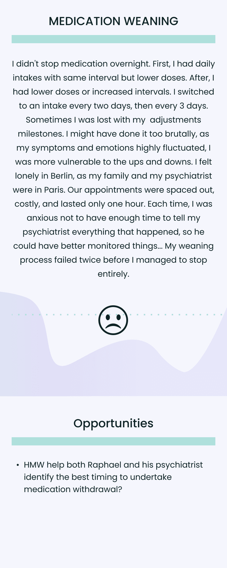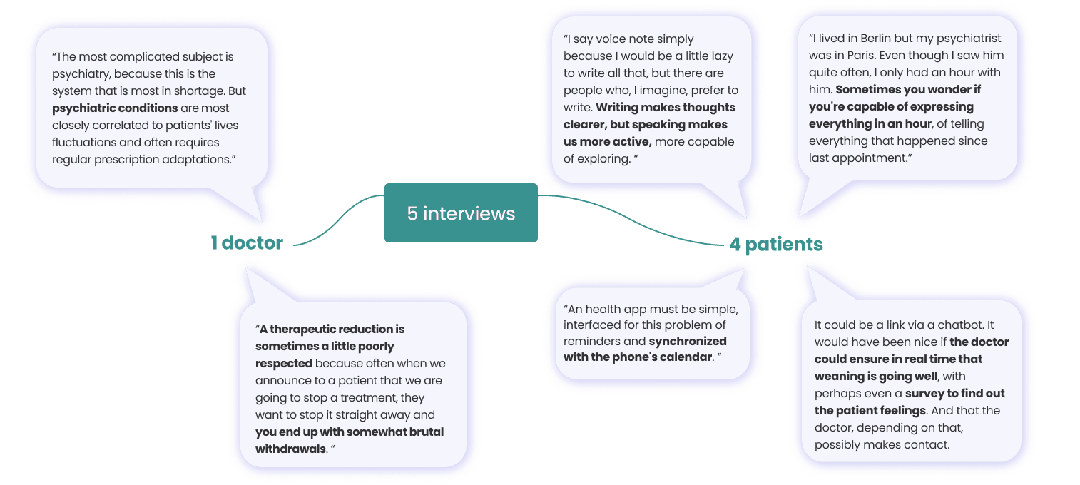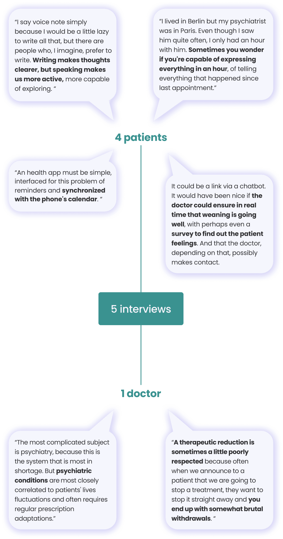 To learn more about the needs and pain points of my audience, I conducted 5 interviews with 4 patients who had already undergone a medication weaning or a prescription change related with their long-term illnesses, plus 1 doctor.
