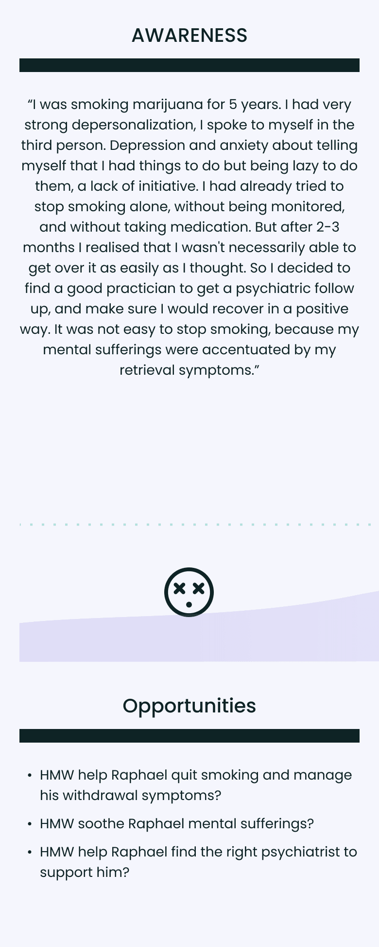 Based on Raphaël's profile, I created his user journey map and identified at each stage what were the main frustrations and the main opportunities, before to ideate on my solution: